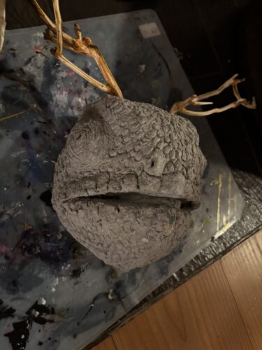 Maskerne laver jeg med good old papmaché på en ballon. Derefter former jeg med avispapir, wire og malertape. Jeg laver glatte flader med selvhærdende ler og tænder af fimo-ler, og så maler jeg dem 3-400 gange.