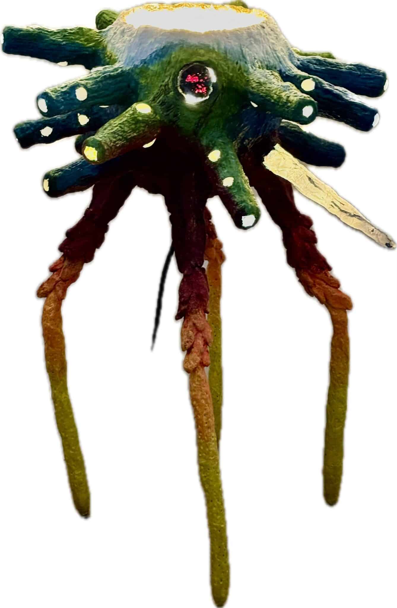 Lampen er lavet af papmaché, ståltråd og elektronik.